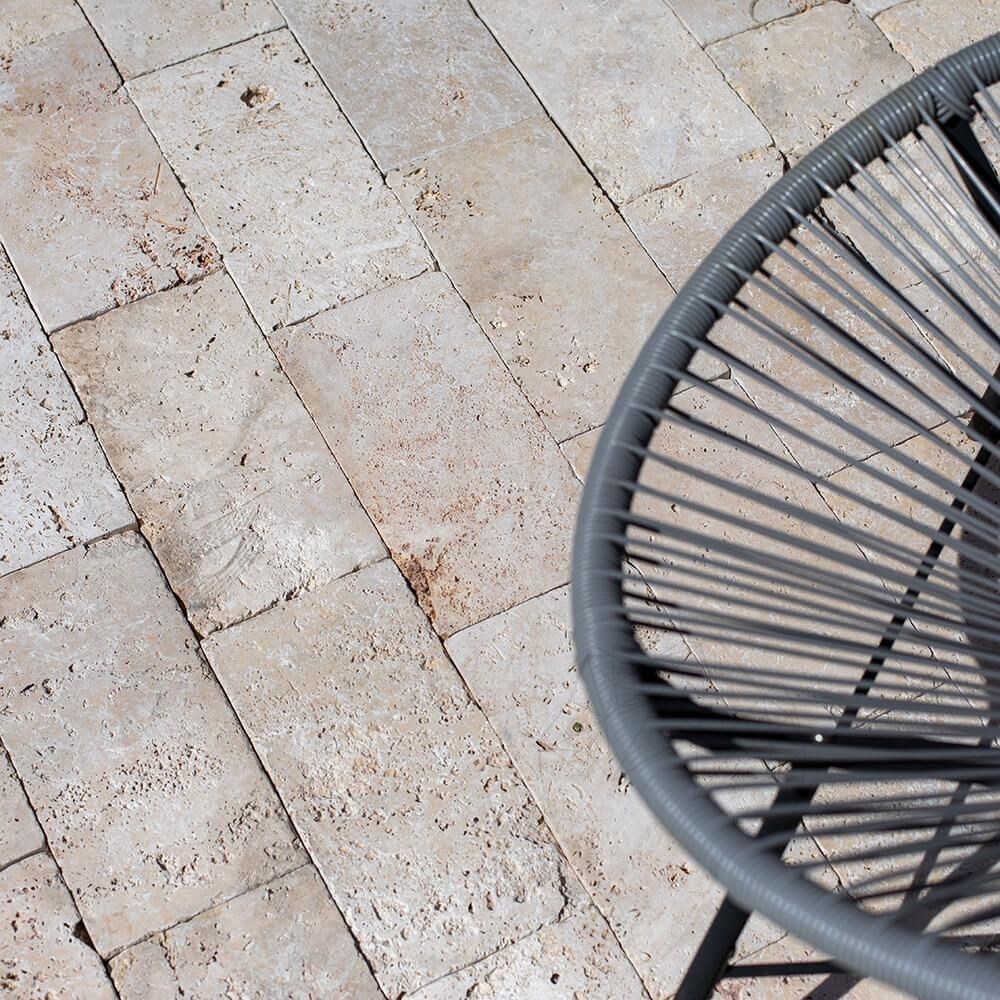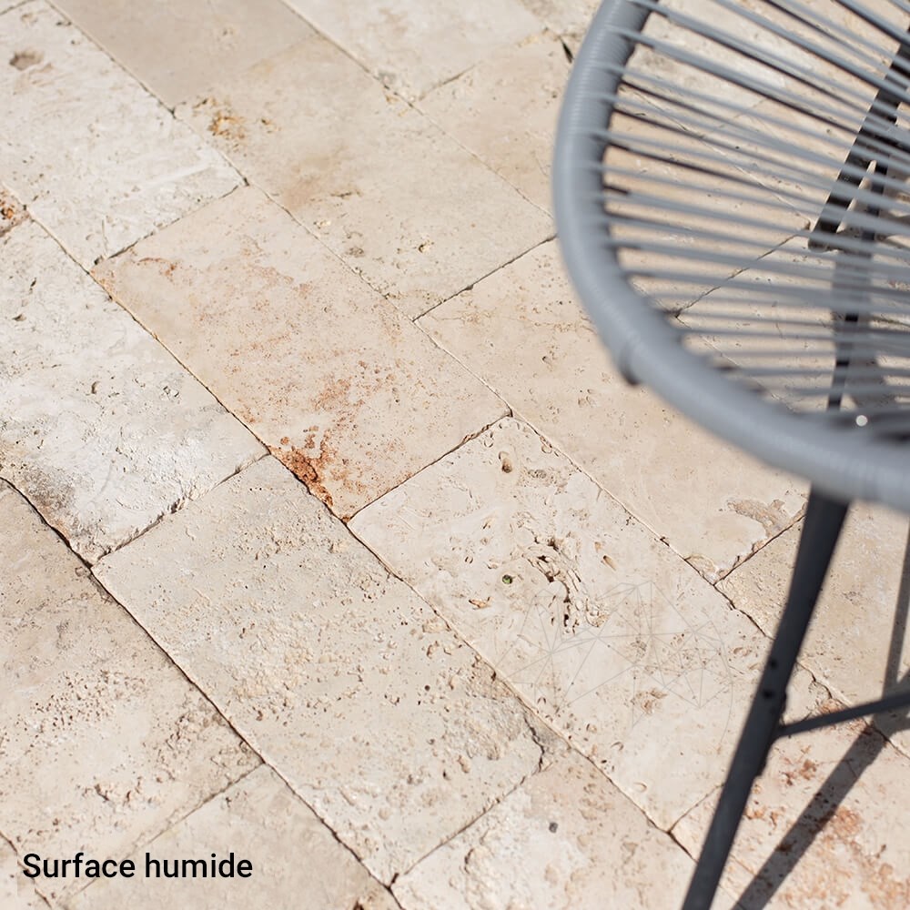 Lors de la planification d’un projet de décoration, tenez compte des matériaux, des tailles et des types de finitions. Sa finition antidérapante fonctionne parfaitement pour le revêtement extérieur et les espaces humides. Un travertin d’un tel ton chaud convient mieux aux terrasses couvertes / non couvertes. Il fonctionne également bien comme décoration d’adaptation de piscine autour des piscines. En outre, vous pouvez également l’utiliser comme pavage extérieur dans les zones à trafic moyen et même lourd. Pourquoi? Parce que la pierre est la durabilité et l’épaisseur de 3 cm est utile. Un si beau ton de crème au beurre transmet le charisme. De plus, la finition tumbled gagne en popularité.