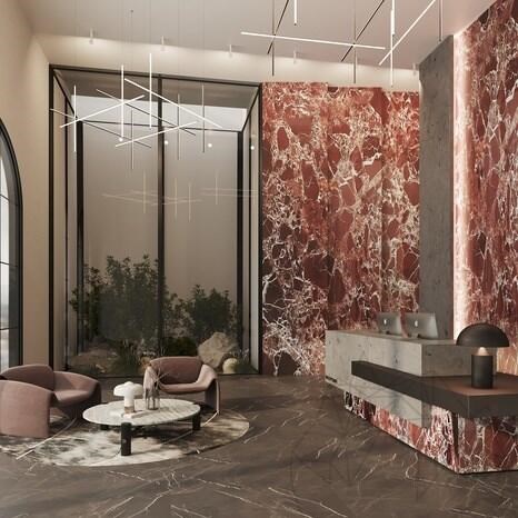 La dalle nous apparaît habituellement comme la dernière expression non travaillée de la pierre naturelle, l'option la plus avancée pour préserver le caractère primitif de celle-ci. Ce qui se passe ensuite, c’est l'industrie, mais la découpe d'un bloc colossal en tranches conserve encore la pierre avec son sens originel, perpétuant sa magie, chiffrée dans des millions d'années d'existence inconnue. La révélation de celle-ci est une faveur que la Terre nous accorde, sans nous demander en retour que de respecter sa sérénité. Les projets utilisant de grandes dalles soutiennent et développent une paix intérieure, améliorant nos conditions de vie, c'est pourquoi l'utilisation des dalles est en forte expansion. PIATRAONLINE – générateur perpétuel d'inspiration et pilier fiable dans le monde des aménagements avec pierre naturelle, vous invite à rejoindre la magie des dalles. Parmi celles-ci, misez sur Rosso Levanto, une marée d'algues en rouge foncé, déchirée par des veines blanches et bordant des îlots stériles.