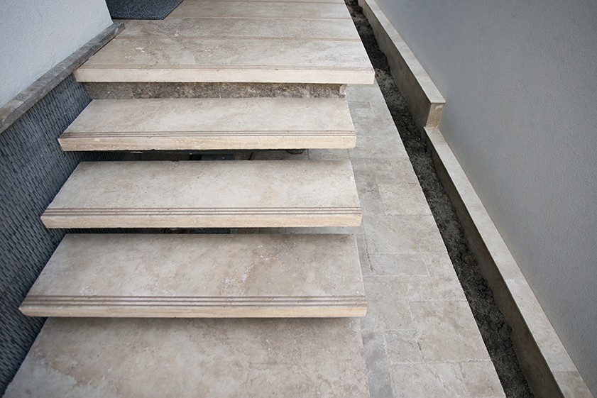Pour fixer les marches, utilisez une couche de chape plus un adhésif ou utilisez simplement l'adhésif (nous recommandons Marmo.Plus). Les marches extérieures, comme celles intérieures, sont installées à l'aide d'un adhésif seulement lorsque nous sommes sûrs que le béton est bon et uniforme. Sinon, les défauts du béton peuvent entraîner la fissuration des escaliers, peu importe leur épaisseur et leur durabilité.