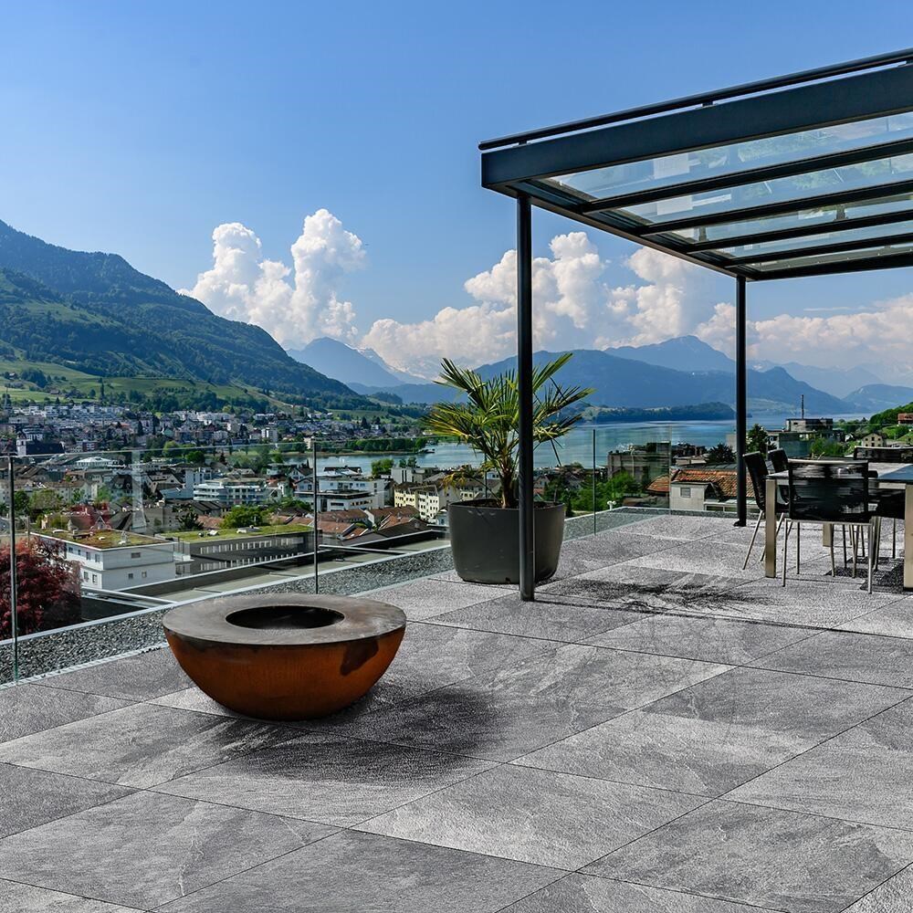 Ce produit convient à diverses applications extérieures, telles que les terrasses couvertes et découvertes, les abords de piscines ou les dallages extérieurs. Il est recommandé pour une utilisation horizontale et verticale en extérieur et résiste à un trafic moyen.