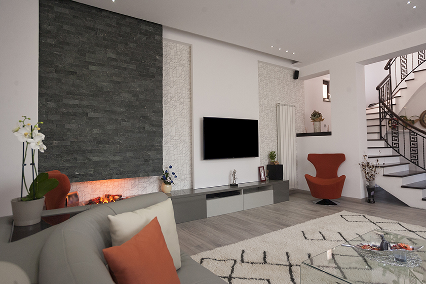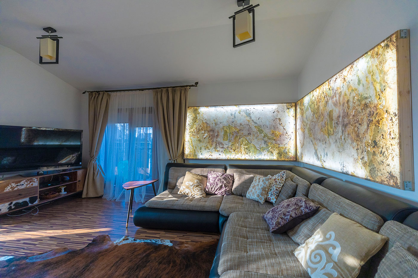 L'effet de minimalisme industriel, parfaitement mis en place et activé par un escalier métallique moderne, est équilibré par un mur de pierre irrégulière et colorée, une zone fonctionnant comme une incitation contre le conventionnel ordinaire. L'influence des idées de décoration vivante, basée sur l'effet translucide est remarquable. Le miel d'onyx poli ignore les liens avec la technologie moderne en utilisant sa caractéristique translucide naturelle.