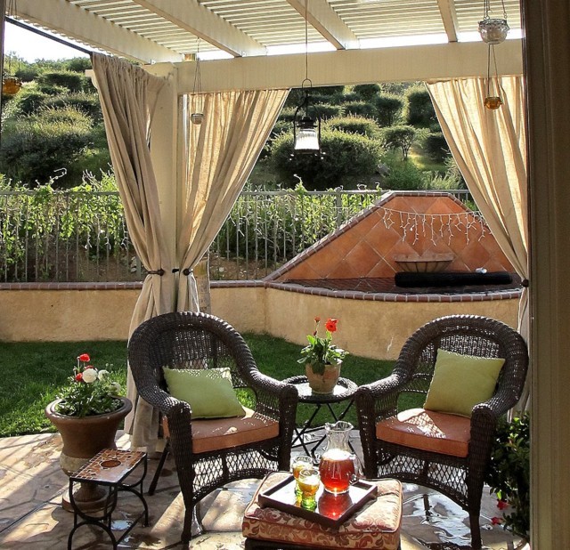 Si les rideaux conviennent parfaitement à votre espace de détente, vous pouvez également ajouter une touche méditerranéenne, chaleureuse et légèrement dramatique à votre espace extérieur. Cette fois, les décisions sont soumises au matériau choisi, à la couleur (la recommandation du designer est d'utiliser un minimum de couleurs dans presque tous les espaces - couleurs complémentaires, pour éviter un espace encombré et ennuyeux) et au système de serrage.